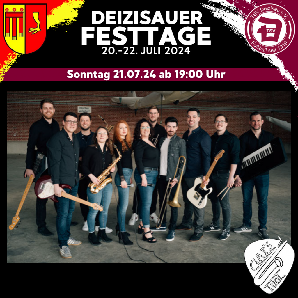 Weiter geht es am Festsonntag abends im Zelt mit der in Deizisau und weit darüber hinaus bekannten Band Clap’s Tool, die wir glücklicherweise auch dieses Jahr wieder für die Deizisauer Festtage gewinnen konnten.